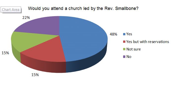 63% of all viewers would attend a church led by Rev. Smallbone and 48% would do so without any reservations. Interestingly this figure was much higher amongst women where 55% would attend without reservation. Only one in five said they would definitely not attend.
