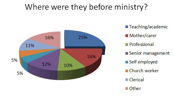 16% went from being a full time mum/carer into Christian ministry; a quarter had a background in education. Only 1 in 20 (5%) had a background in church work.
